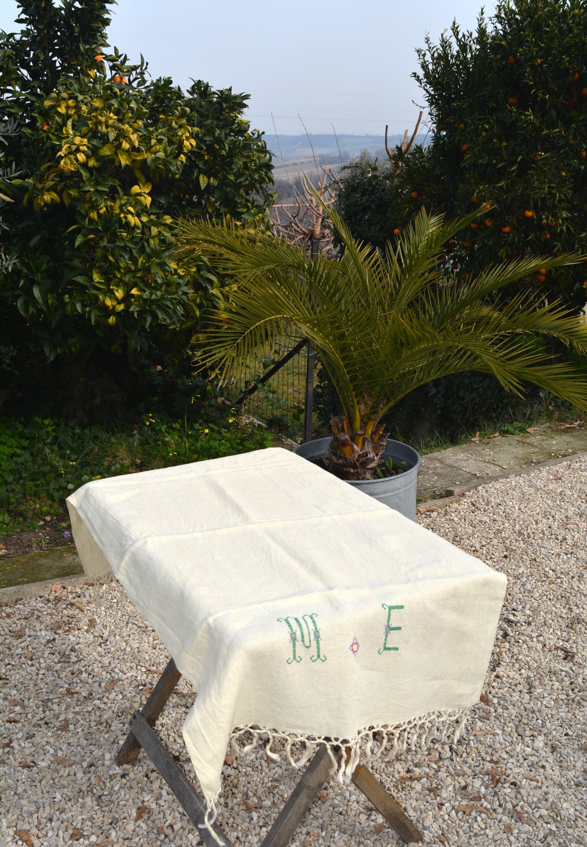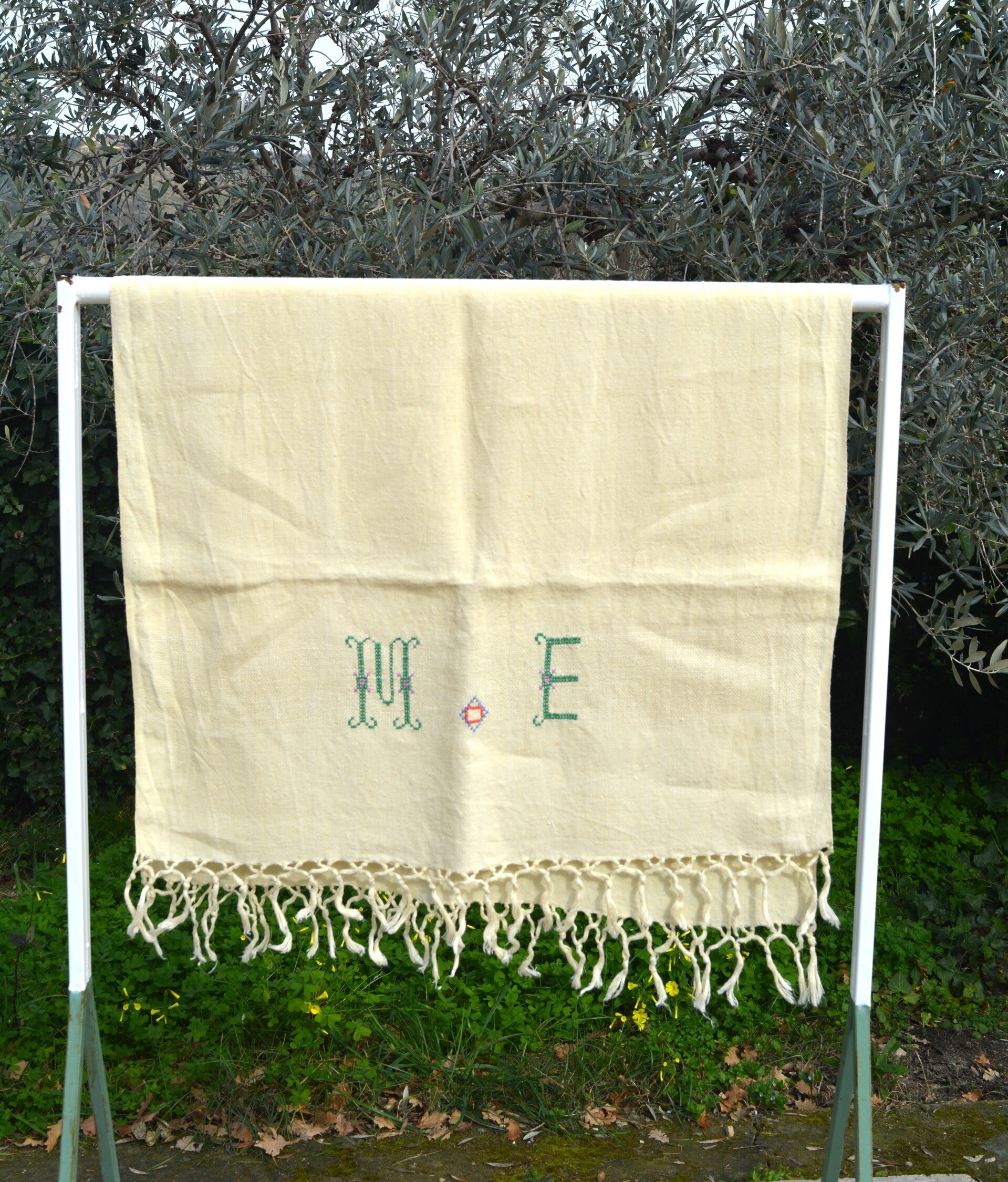 Vintage handwoven cloth in linen, with hand-embroidered initials "M & E". Ground color and fringes (on both ends) are a warm, creamy ecru, cross-stitched initials embroidered for the most part in green, with a little bit of lilac, red and blue. Size: 120cm high and 70cm wide.