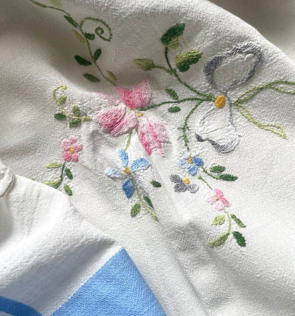 Lovely delicate cotton tablecloth with woven-in borders and a floral embroidery. Comes in an off white ground, soft blue borders and subtle floral embroidery in pastel colors, flat machine-stitched. The fabric is a lighter weight cotton (a bit transparent when placed on a dark table), woven in a slight crêpe-weave structure with borders in satin-weave.