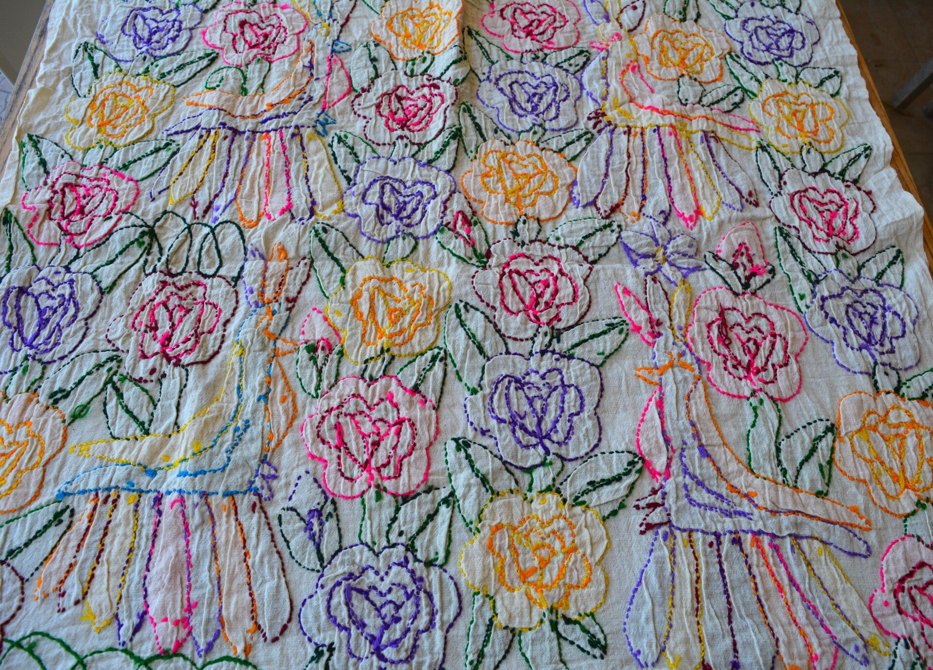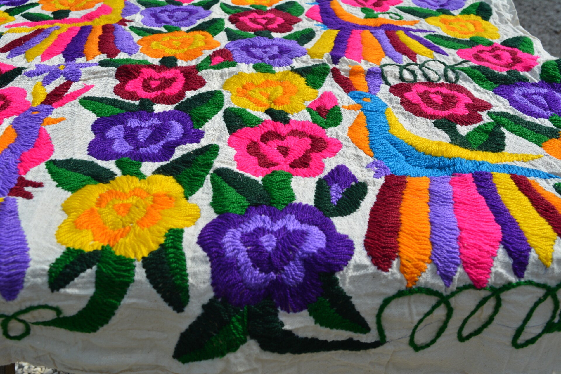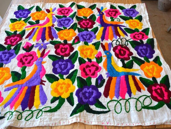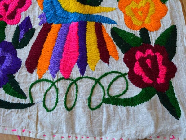Instant joy is upon you, looking at this flamboyant and exotic piece of hand embroidered textile! An explosion of color in the embroidery work, featuring flowers and 4 birds with a sturdy crest and spread wings (reminding me of the hoopoo); effected in course woolen yarn on a lightweight cotton/linen sheeting in ecru. Two edges are handstitched in pink and the size is roughly 80 x 88 cm. I can see it hanging on the wall, or made into a big cushion with plain back, or even as curtain for a small window. Picked it up in Italy, don't know its background though.