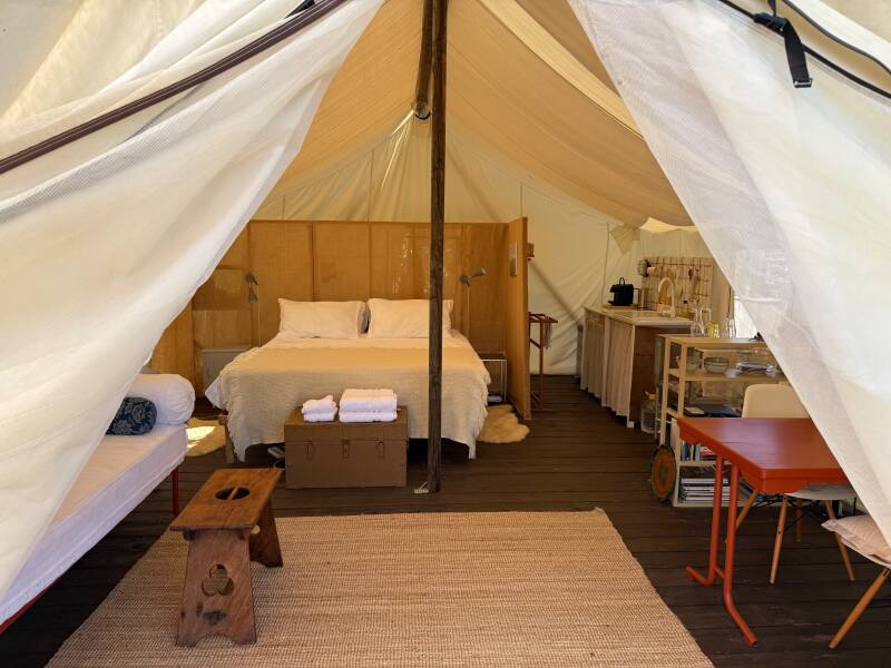 THE LODGE is a one-of-a-kind: both exterior and interior are custom-built. Where possible, material, furniture and accessories are collected, upcycled or self-made; our own rather ecclectic style is reflected in this, up to the details. The tent is spacious (in fact much more spacious than appears on foto's), with a ridge height of 4m and 30m2 large just inside; our focus in creating this space was without doubt on comfort with a sense of luxury. There is a quality king-size bed, provided (off course) incl. the soft linen and cotton bedding, as well as soft towels and kitchen linens. One step outside brings you to the semi-outdoor showerroom (with amenities) with toilet and in the outdoor kitchen you can perform your skills on the local groceries and freshly picked herbs from our grounds. The airy cotton tent is amazingly cool also during summer nights, while the sun roof filters the harsh summer sun out on the deck.